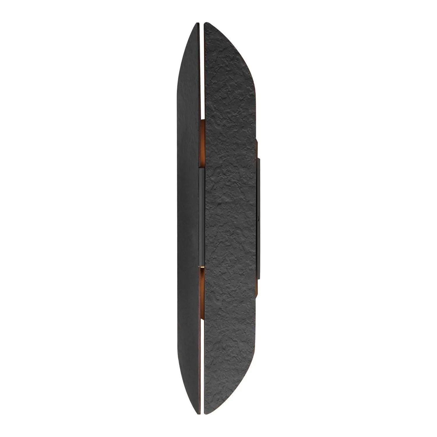 An enigmatic light source projects from the wall, obscured by two panels with an organic textural relief and split down the center to cast soft ambient light. Open at the top and bottom as well, the light shines both upwards and downwards and signals the source of its illumination through the crevice that it creeps out from. Finished in Matte Black externally, the interior of the sconces are powder coated antique brass to add warmth to the rustic glow. Available in 3 sizes, this ADA compliant sconce series adds mystique to the spaces it's installed.