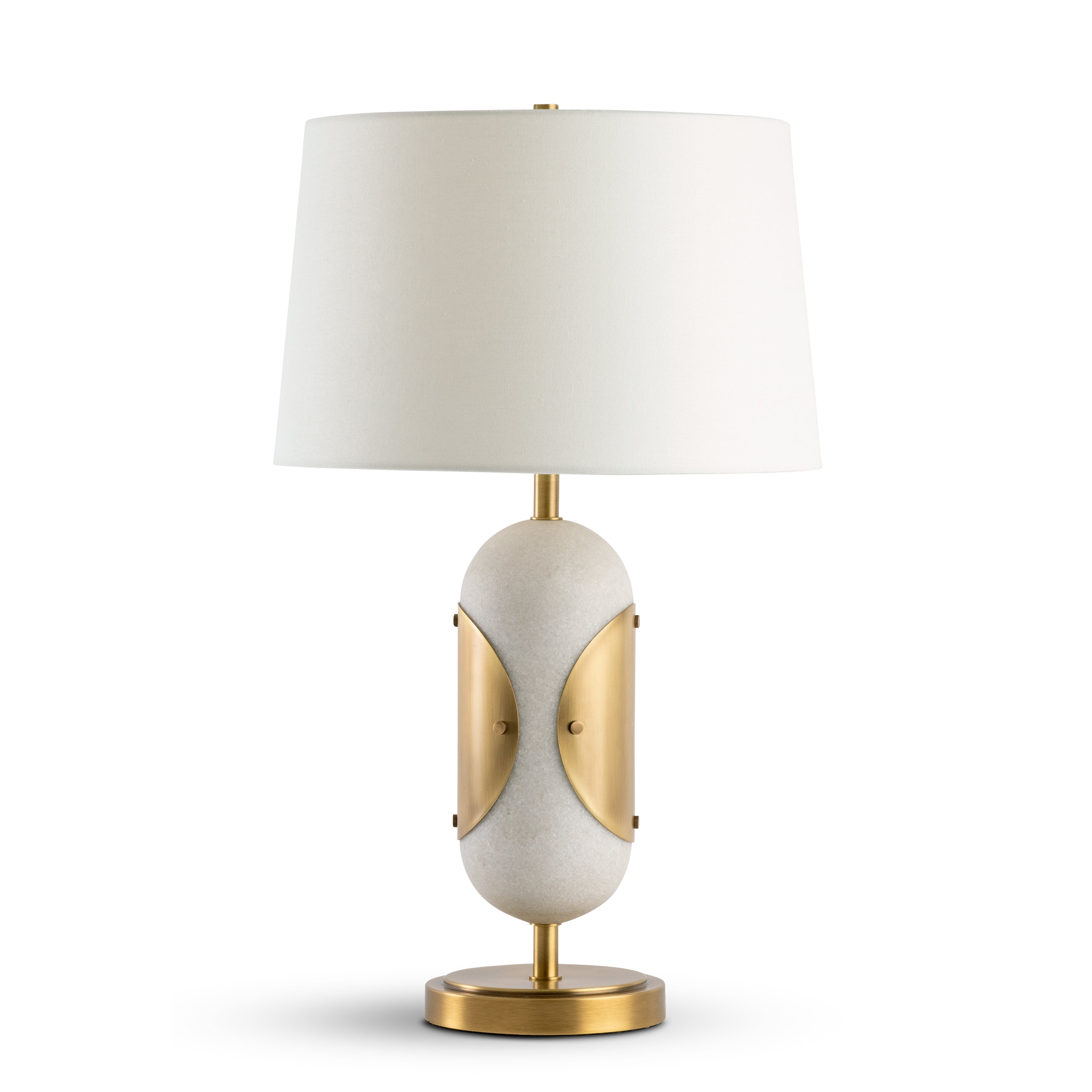 This artistic composition is sure to become an instant statement piece. The eye-catching Ovaro Table Lamp features a capsule-shaped body made from ivory composite stone flanked by two decorative metal plates in antique brass, each one secured by decorative thumb screws. This lamp is a sculptural conversation-starter ideal for prominent placements.