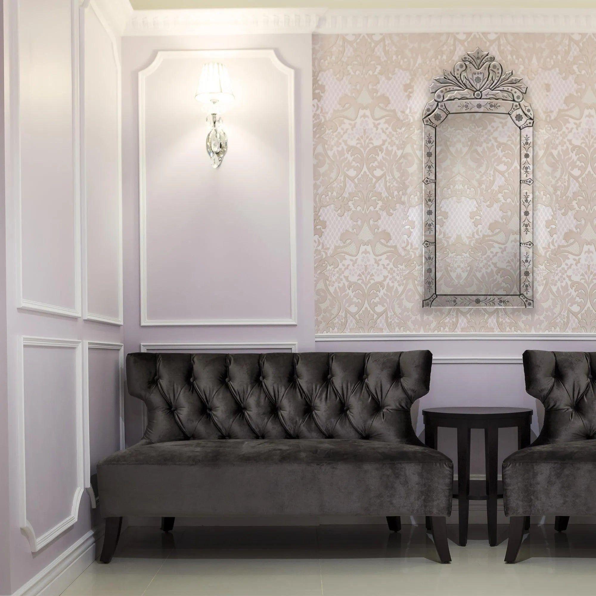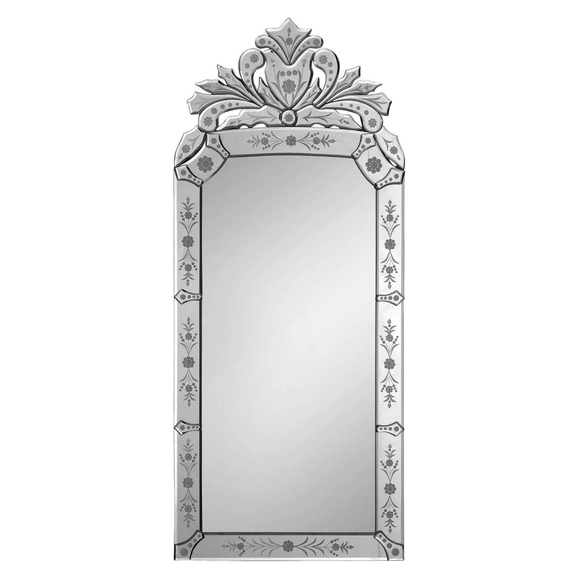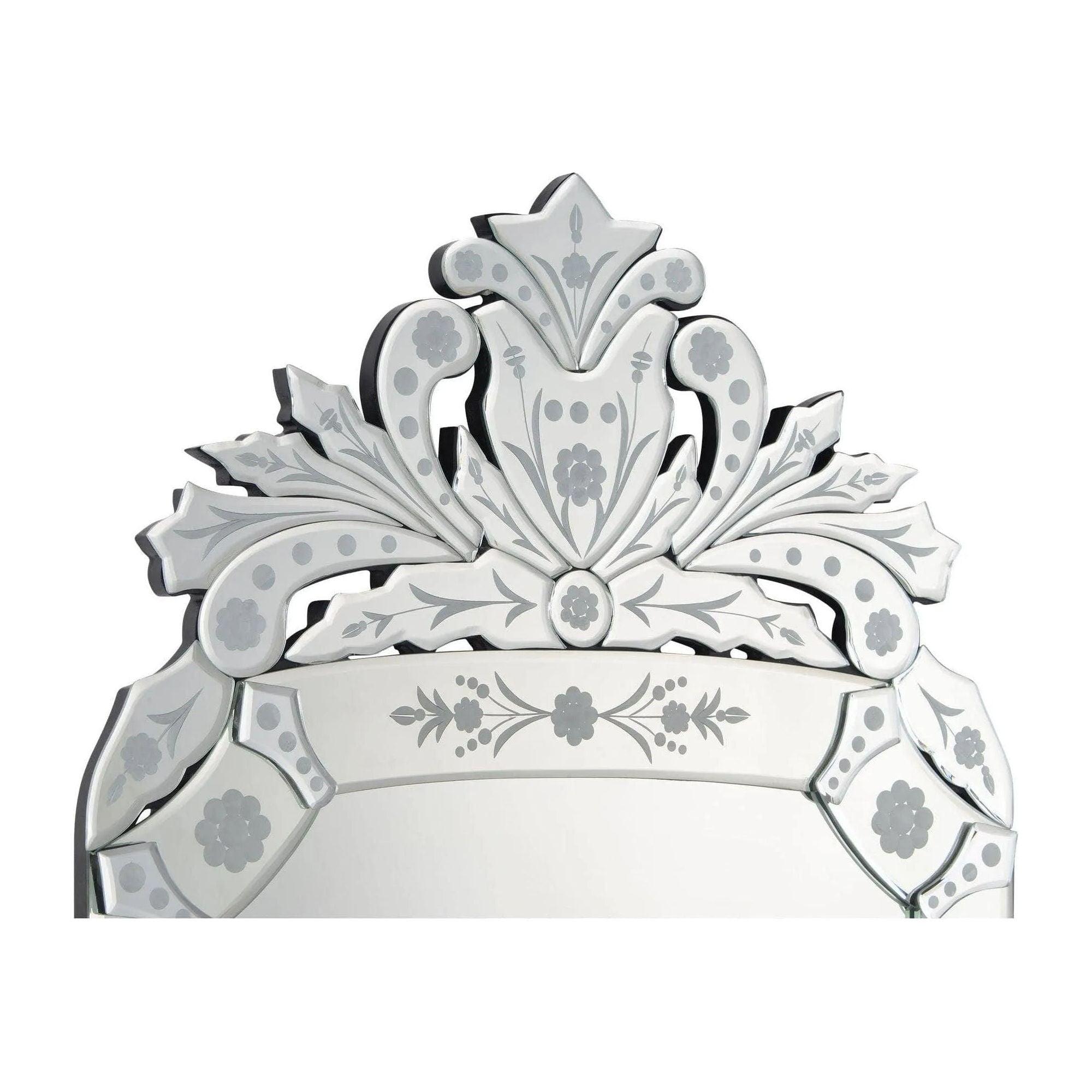 This elegant Venetian mirror is a classic design with beautiful etched details an intricate crown.