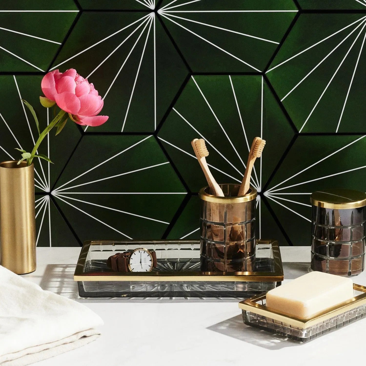 Our Argos bath collection takes a modern turn with textured antique-inspired glass, accented in nickel or brass trim.