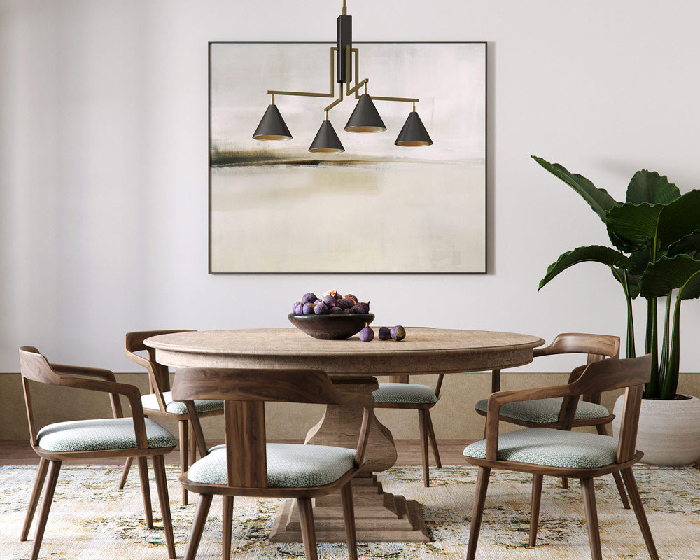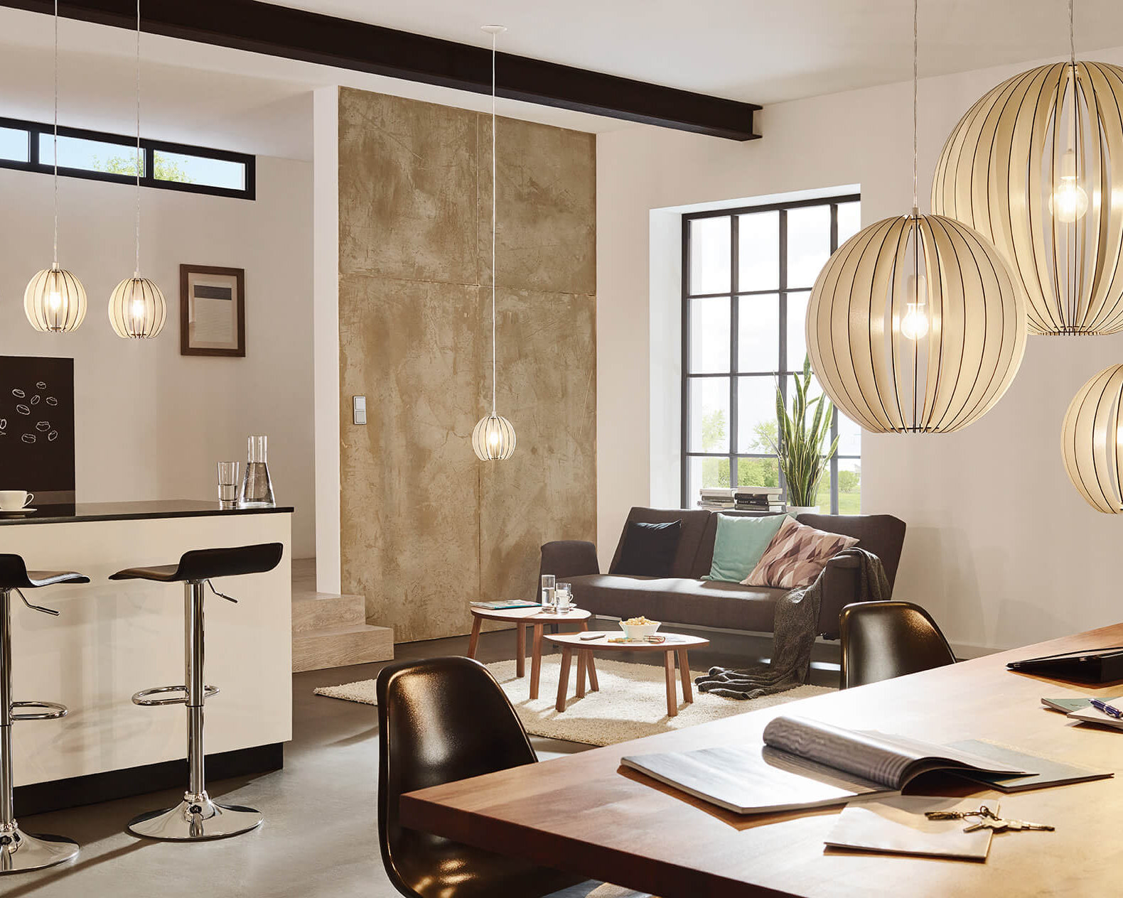 Minimalist office with pendant lighting
