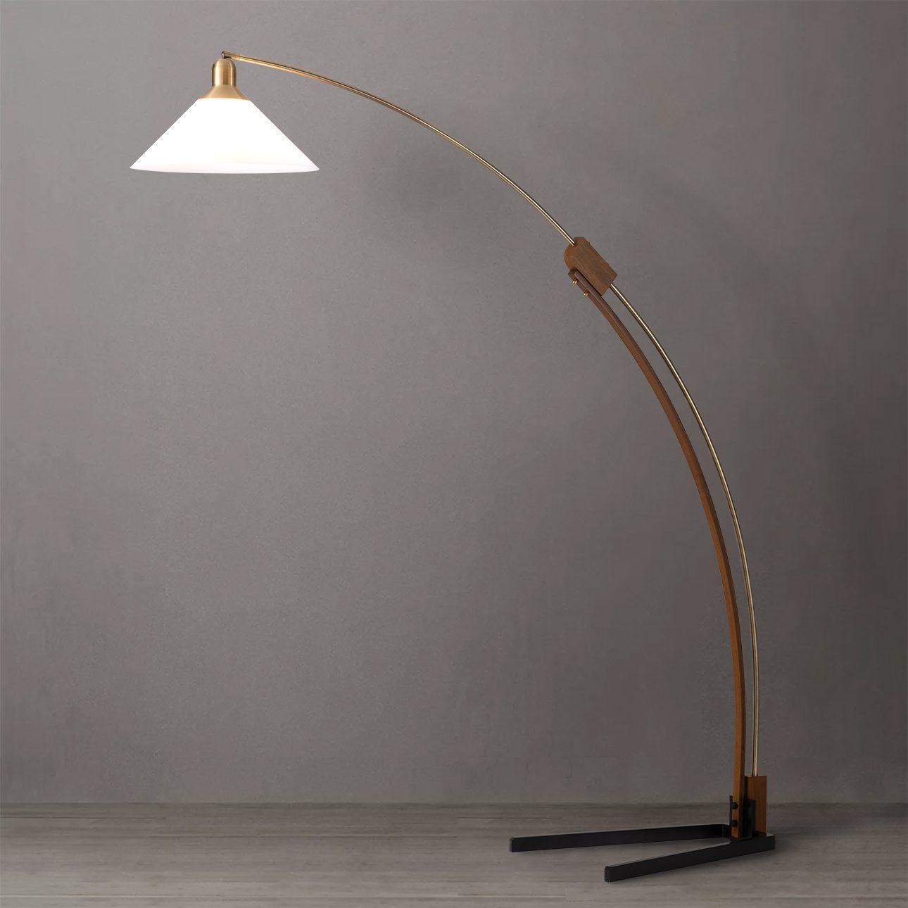 Originally crafted from red oak, bendable Italian poplar, polished brass & blow molded Lucite, The Melmar Arc floor lamp has been reissued from the Nova vault. This reissue includes all the mid-century style while boasting modern updates for today's discerning tastes. Adorned with a rich dark brown wood and weathered brass finish, complementing its iconic bent wood styling, the Melmar radiates an aura of refined elegance. The Lucite cone-shaped shade follows the original design while skillfully shading the bulb, casting a warm and inviting glow that enchants any space. The sturdy base ensures that once positioned, the lamp stays in place. Melmar is equipped with a dimmer switch, providing just the right light to read by, enjoy a warm glow or entertain in your living room.