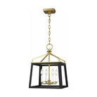 The Carlow four light single tier chandelier in midnight black by Chapman & Myers is a traditional tapered square lantern which is wider at the base and smaller at the top. The body of the lantern has either a black or white metal frame suspended from, and accentuated by, a brass square tube armature. The brass armature is the focal point of the design, and almost looks like a crown on top of the lantern frame.