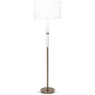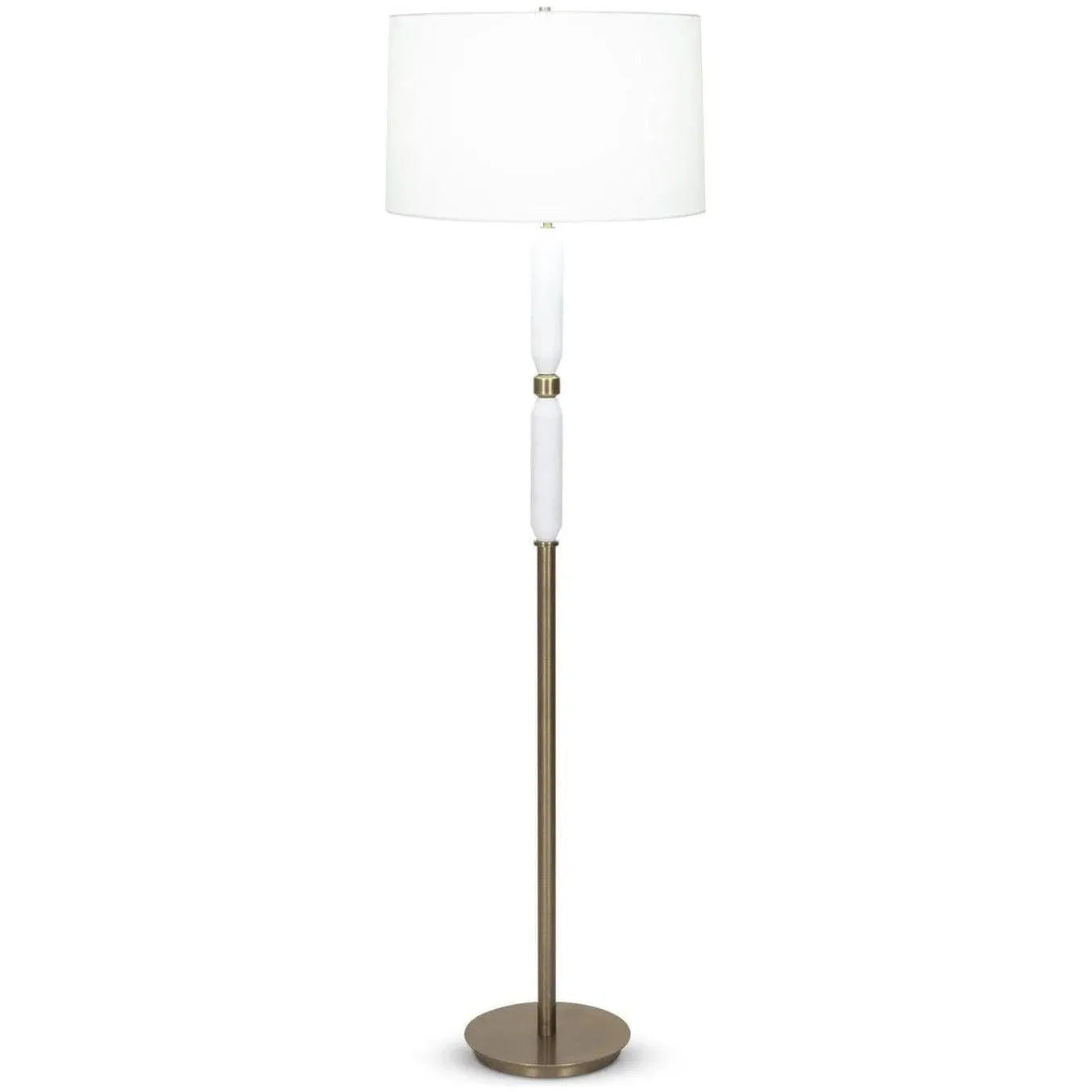 Two white marble cylinders decorate the stem of this standard floor lamp, creating an elegant, trendy look against the Antique Brass body. An Off-White linen tapered drum shade tops the look. Place this lamp in a living room reading nook for style and function.