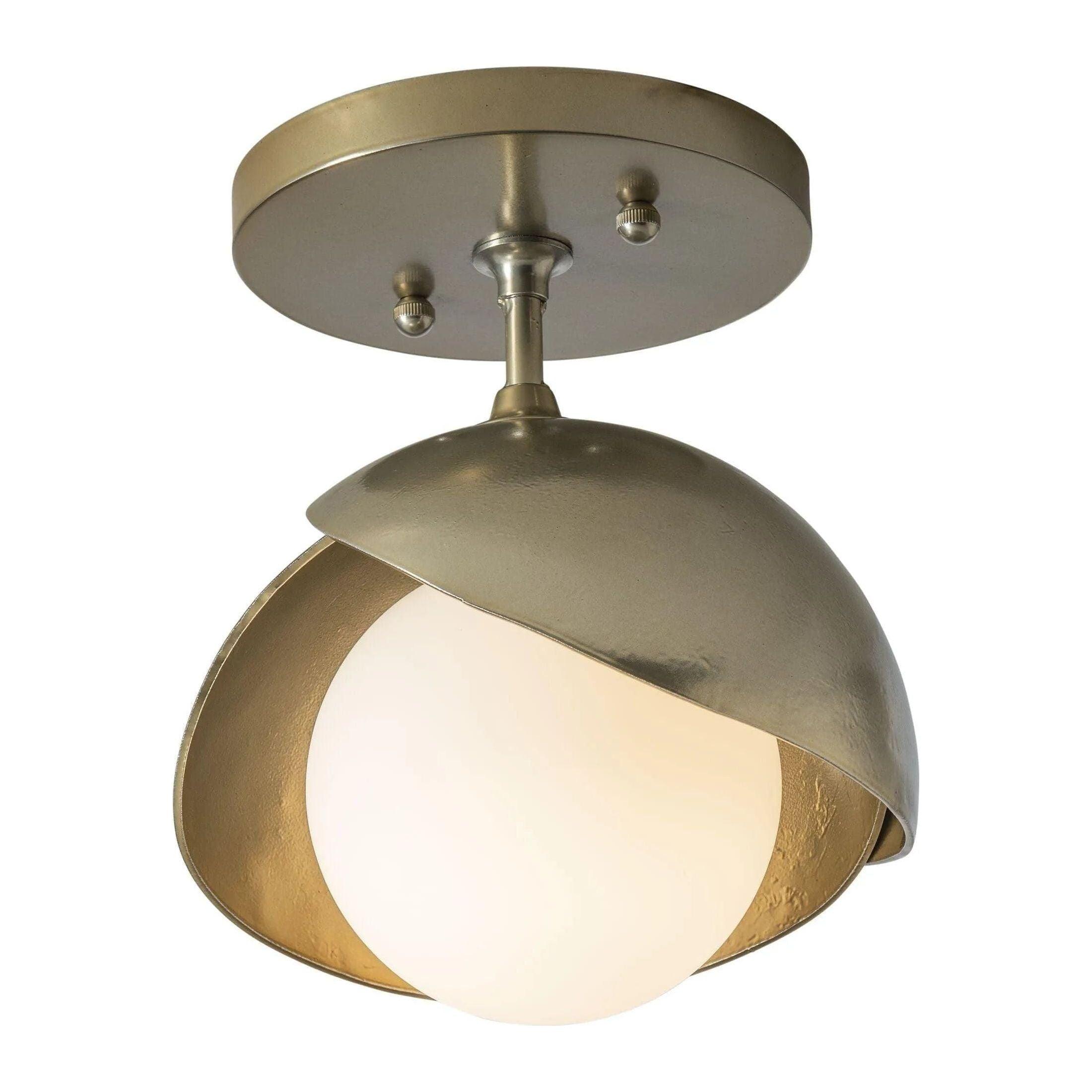 One light semi-flush ceiling light with a forged steel shade. Choose a finish for the canopy, stem and outermost metal shade and an accent for the inner metal shade. The metal shades may be rotated to alter the look.