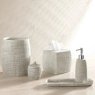 Crafted from embossed porcelain and inspired to reflect woven raffia palms, this accessory set adds a feeling of natural refinement to the bath.