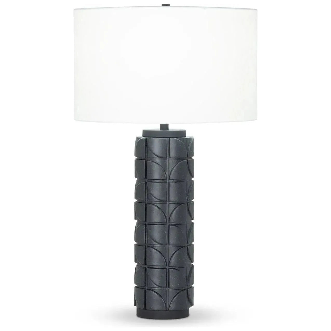 This matte black table lamp creates a play on dimension and pattern with its sculpted body. A contrasting Off-White cotton drum shade pops against it. Perfect for a contemporary living room or bedroom, this lamp would add an interesting neutral touch.