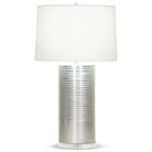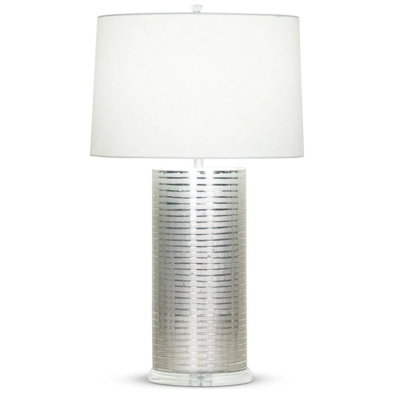 The body of this table lamp — mouth-blown glass with a grey carved finish — is visually textural and elegant with a handmade feel. A crisp Off-White linen shade and round acrylic base act as complementary accents. Place this sizable lamp in a modern living room to give it an eclectic quality.
