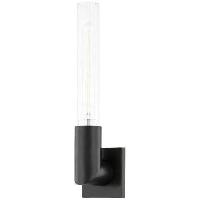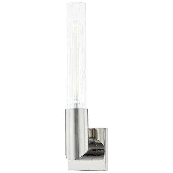 Asher's stark, square backplate and thick, sleek arm have a utilitarian vibe while the ribbed, clear glass cylindrical shade gives the fixture a warmer, textural feel. Light from the incandescent bulb reflects beautifully through the ribbed glass shade. Available in Aged Brass, Old Bronze and Polished Nickel.