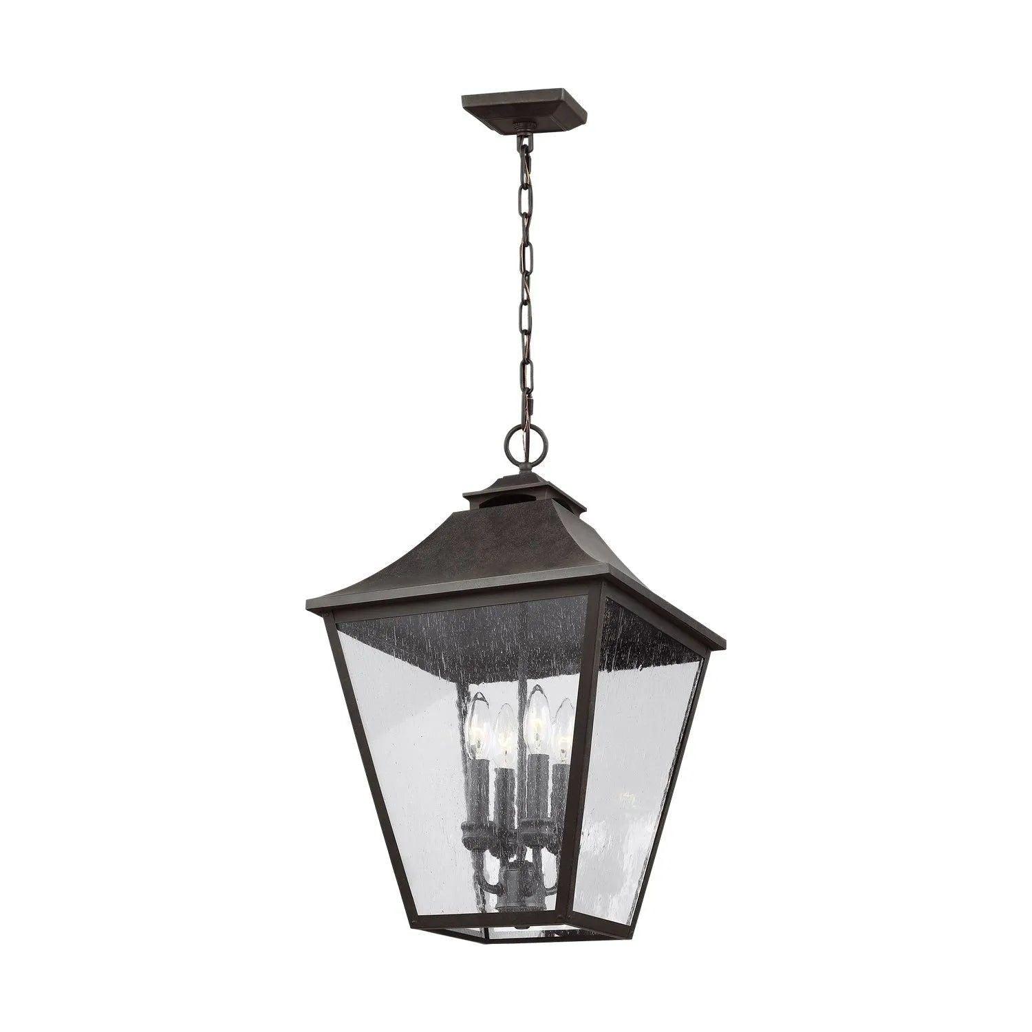 The Sean Lavin Galena four light outdoor pendant fixture in sable enhances the beauty of your property, makes your home safer and more secure, and increases the number of pleasurable hours you spend outdoors. Galena is a Europe-inspired classic lantern. Simple and refined, Galena features a gently curved hook detail atop a vented, square-off roofline, and candle tubes floating within the tapered Clear Seeded glass shades. Galena is a warm, welcoming silhouette offered in our NEW Sable finish.