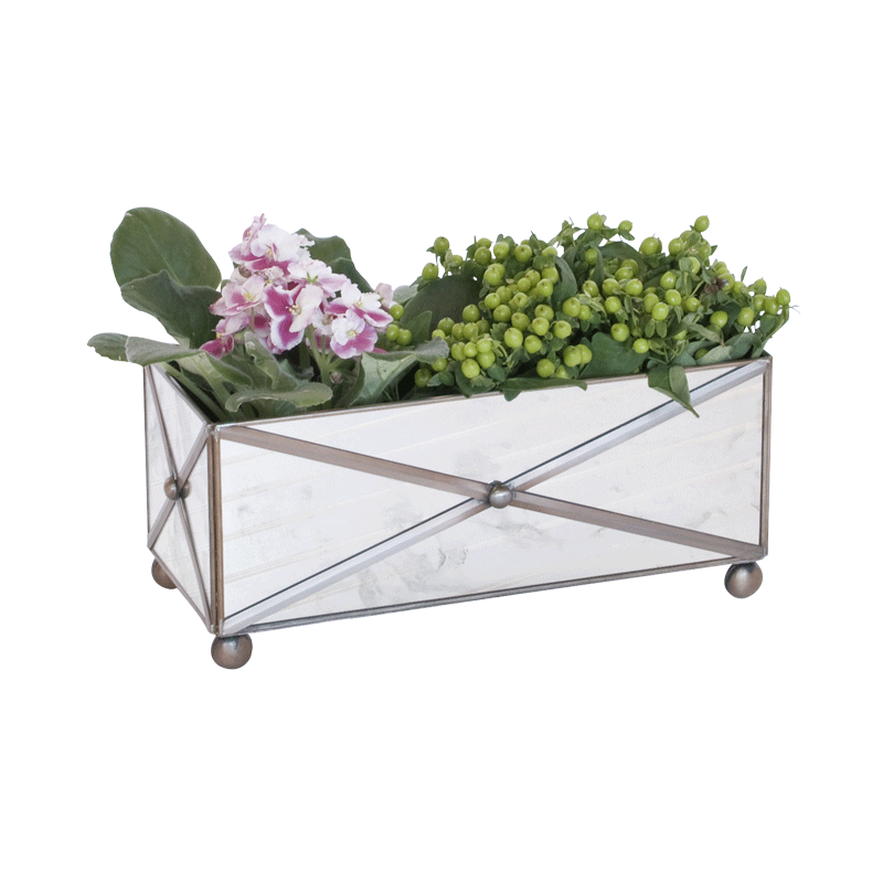 Bring a touch of French provencial living to your indoor or outdoor garden room. This rectangular planter is finished with a distinctive crosshatch pattern and antique mirrors on raised ball feet.