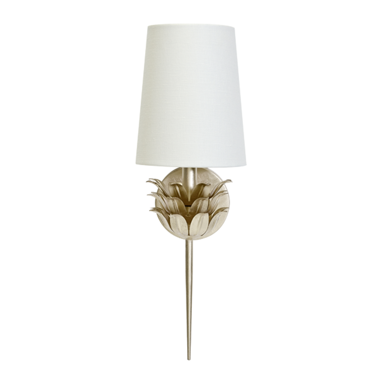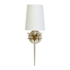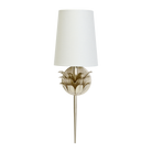 Add a cozy interplay of light and shadow to any room with this elegant, one-arm sconce featuring a graceful, three-layer botanical motif. Finished with hand-applied gold leaf and topped with a white linen shade, Delilah evokes an inviting, radiant sophistication, especially when paired to accentuate a mirror or secretary.