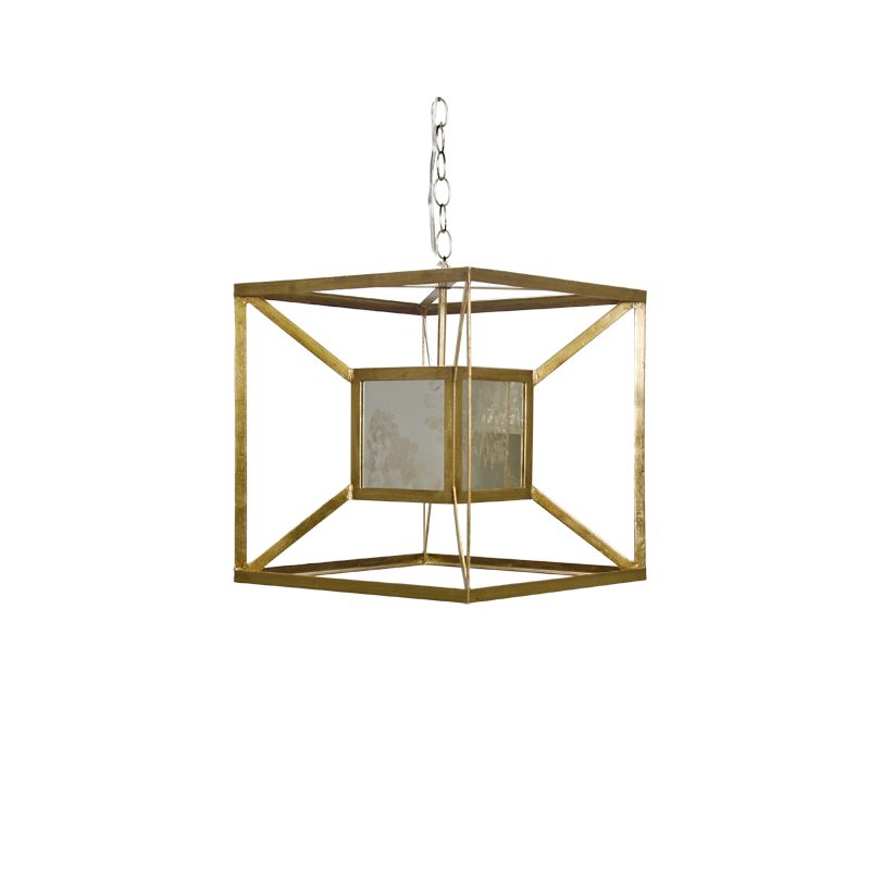 Our lovely Maxwell pendant is designed to create the illusion of dimension while amplifying light from its petite center. Iron framework with a gold leaf finish surrounds an antique mirror fixture. Radiant and unique!