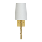 Our petite Molly sconce offers a dose of tropical detail with its bamboo styling. Features a linear base hand finished in gold leaf with a crisp white linen shade. Decorate your powder room with these paired on opposite sides of your favorite mirror.