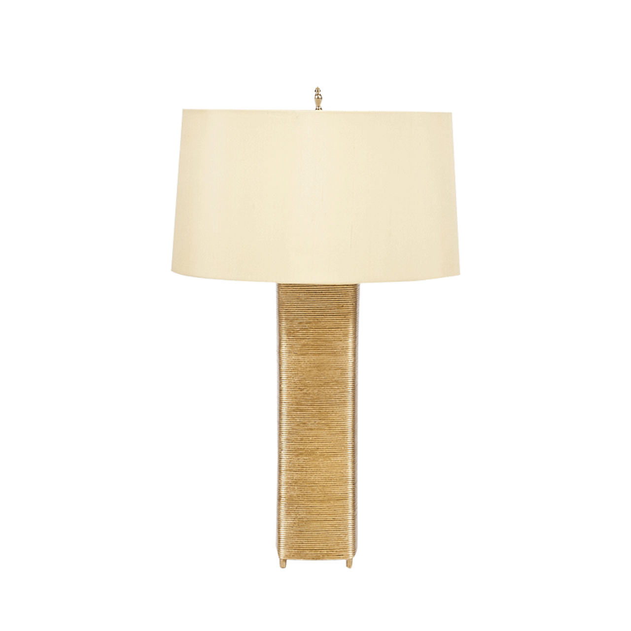 Like an elegant piece of jewelry, our Wrapt table lamp glitters and glows in the light. Gold leaf wire wrapped base with a drum shade in buttercream linen.