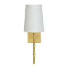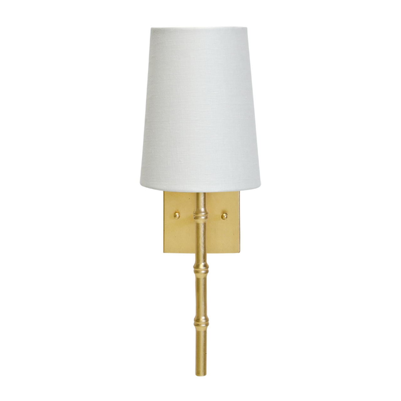 Our petite Molly sconce offers a dose of tropical detail with its bamboo styling. Features a linear base hand finished in gold leaf with a crisp white linen shade. Decorate your powder room with these paired on opposite sides of your favorite mirror.