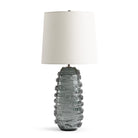 A smooth glass body sets the stage to make the Livorno Table Lamp sparkle, while a cascading stripe of texture twists around the composition with a dynamic flourish. This work of art is crafted from weighty glass with a smokey grey tint that enhances every detail. It includes a tapered drum shade in off-white linen.