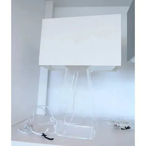 A minimalist statement in form and proportion, Tube Top combines a transparent formed acrylic base to support its elegant mesh fabric shade in tension, steering away from conven- tional modes of construction. Its lightweight shade appears to float freely, gently tethered by its fabric cord. Tube Top is available in multiple table, floor and pendant models.