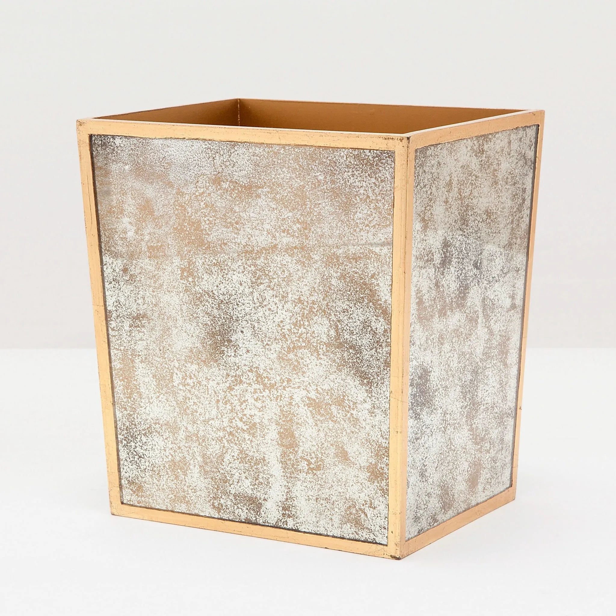 Antiqued mirror bath collection with silver or gold-leafed wood trim.