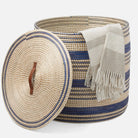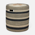 Woven seagrass in a multi-stripe, two-color pattern. Detachable lid with leather handle.