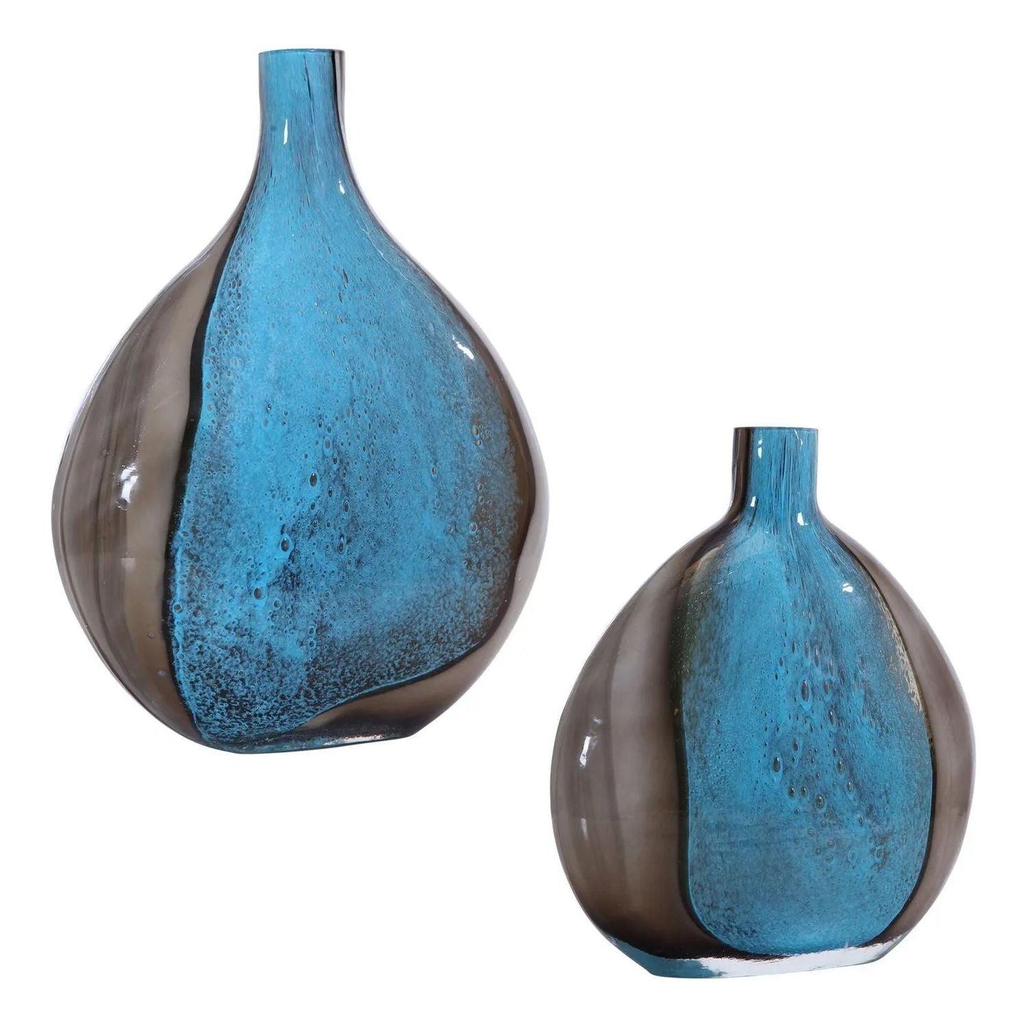 Ensemble de deux, les vases en verre d'art présentent des teintes en bleu cobalt profond et noir. Tailles: S-10x11x3, L-11x14x5