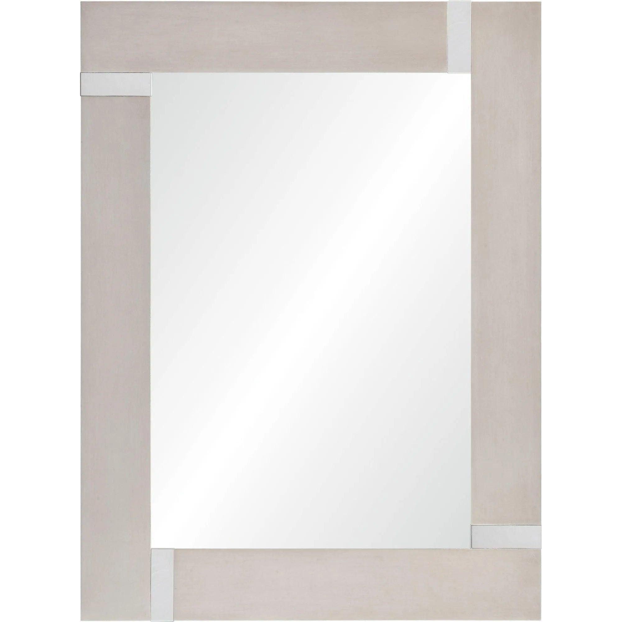 Ce miroir moderne présente une finition en feuille d'argent mise en évidence avec des accents de coin chromés. Le miroir est biseauté.