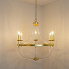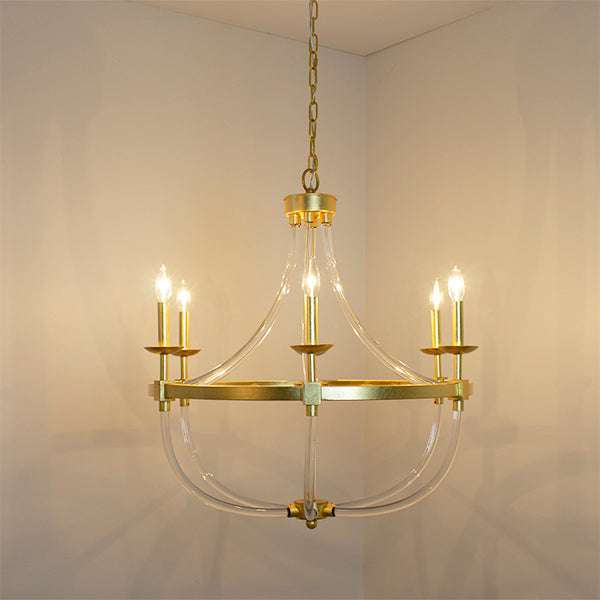 Create a dramatic focal point with the Layla chandelier. The elegant form is sculpted with an acrylic frame, delicate gold leaf detailing, and is UL approved for (6) 40W candelabra bulbs. A 6' matching chain allows for flexibility in installation, no matter how high your ceilings soar.