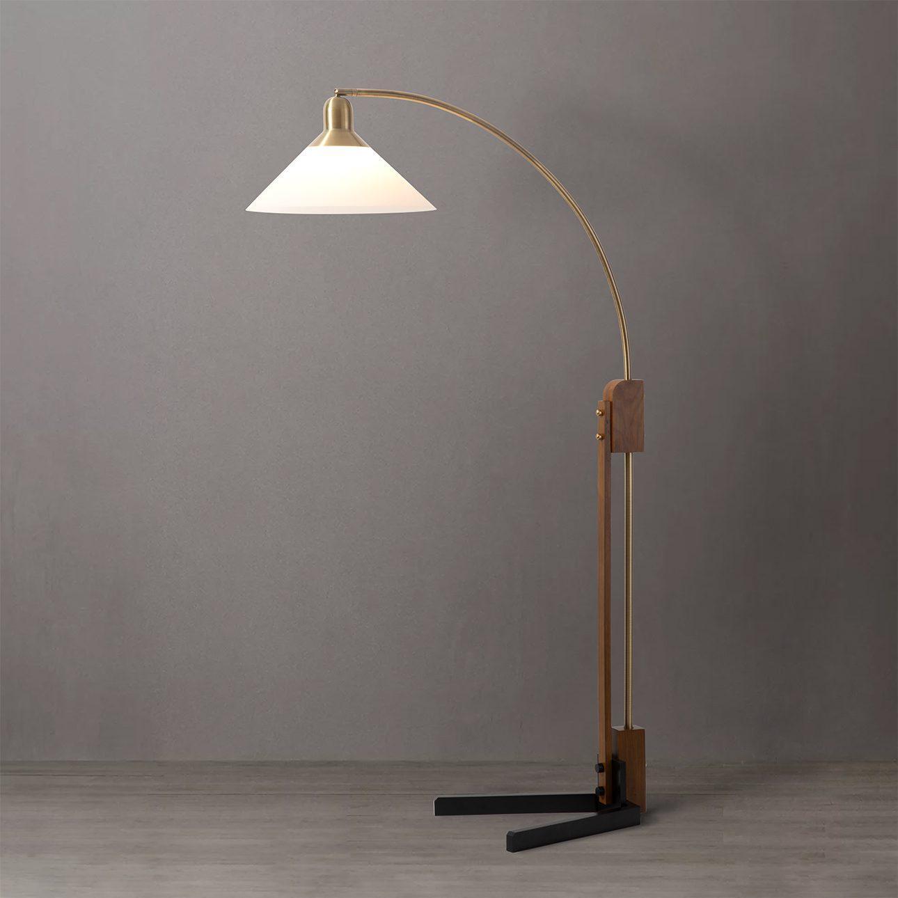 Originally crafted from red oak, bendable Italian poplar, polished brass & blow molded acrylic, The Melmar Chairside Arc floor lamp has been reissued from the Nova vault. Originally designed by Viennese designer, Peter Morelli in 1962, this reissue includes all the mid-century style while boasting modern updates for today's discerning tastes. Adorned with a rich dark brown wood and weathered brass finish, complementing its iconic bent wood styling, the Melmar radiates an aura of refined elegance. The tapered Lucite shade mimics the original design while skillfully shading the bulb, casting a warm and inviting glow that enchants any space. The sturdy base ensures that once positioned, the lamp stays in place. Melmar is equipped with a dimmer switch and provides just the right light to read by or enjoy a warm glow.