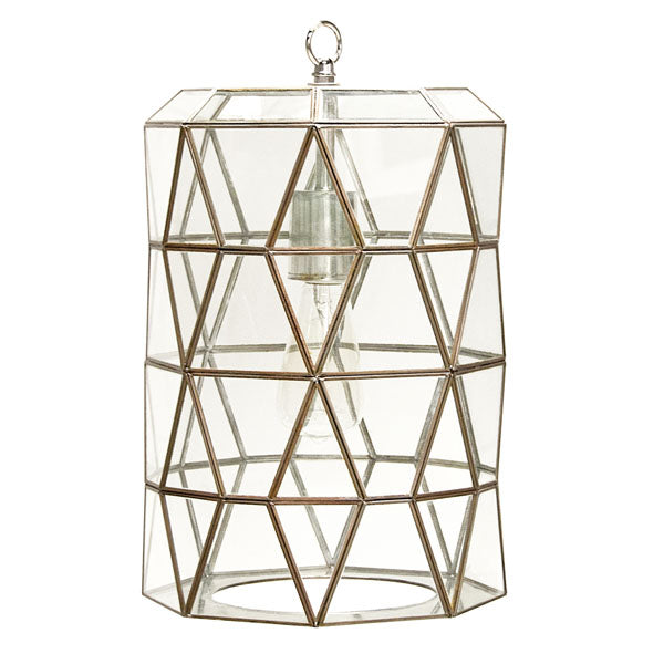 The elongated drum shape of our Mariah pendant light is accentuated by golden-edged glass facets that sparkle and reflect the light, creating a bold, eye-catching graphic statement. Stunning day or night, Mariah looks great hung solo in an entry way or paired together above your favorite Worlds Away console.