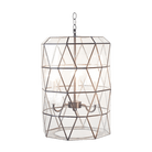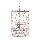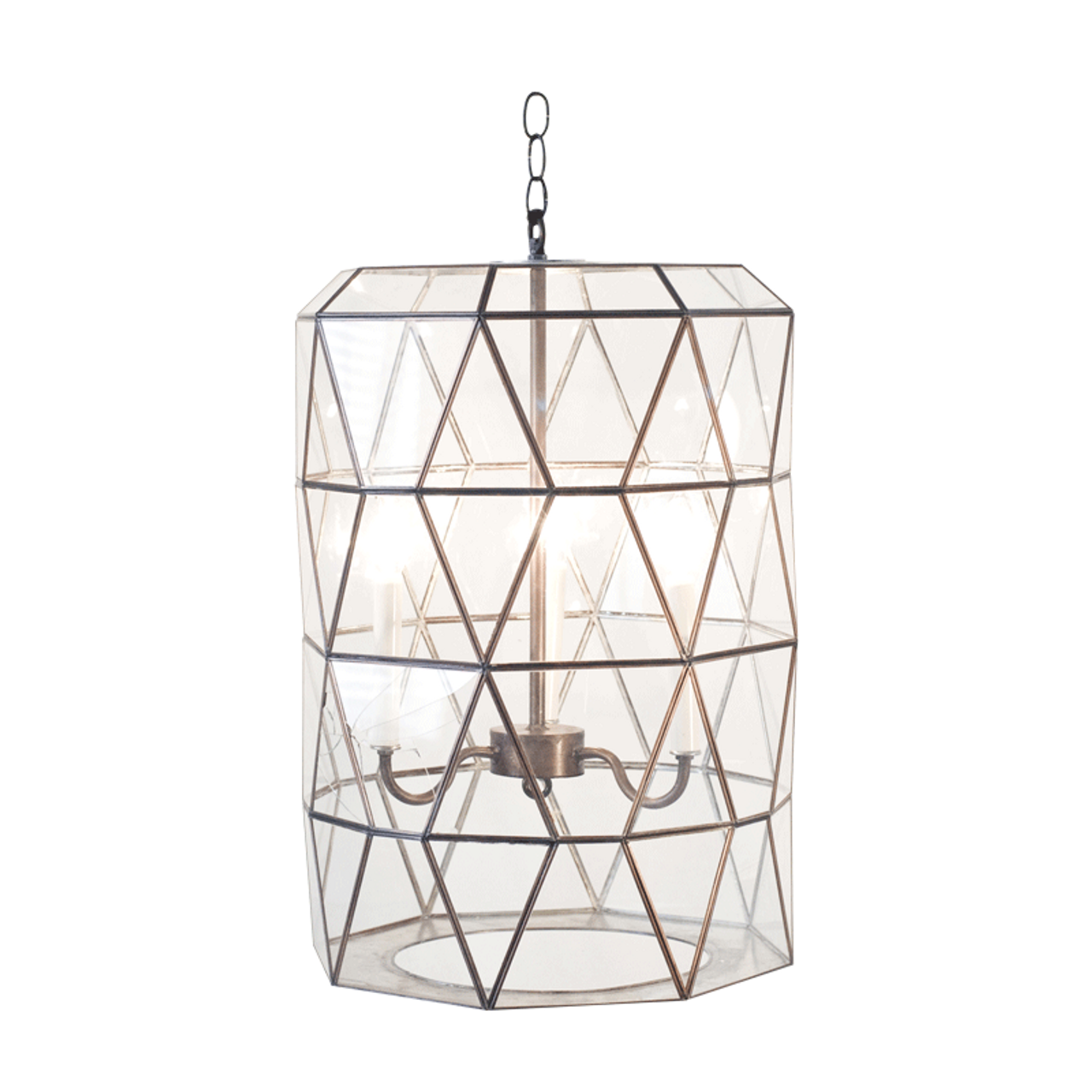 The elongated drum shape of our large Moderna pendant is accentuated by golden-edged glass facets that sparkle and reflect the light, creating a bold, eye-catching graphic statement. Stunning day or night, Moderna looks great hung solo in an entry way or paired together above your favorite Worlds Away console.