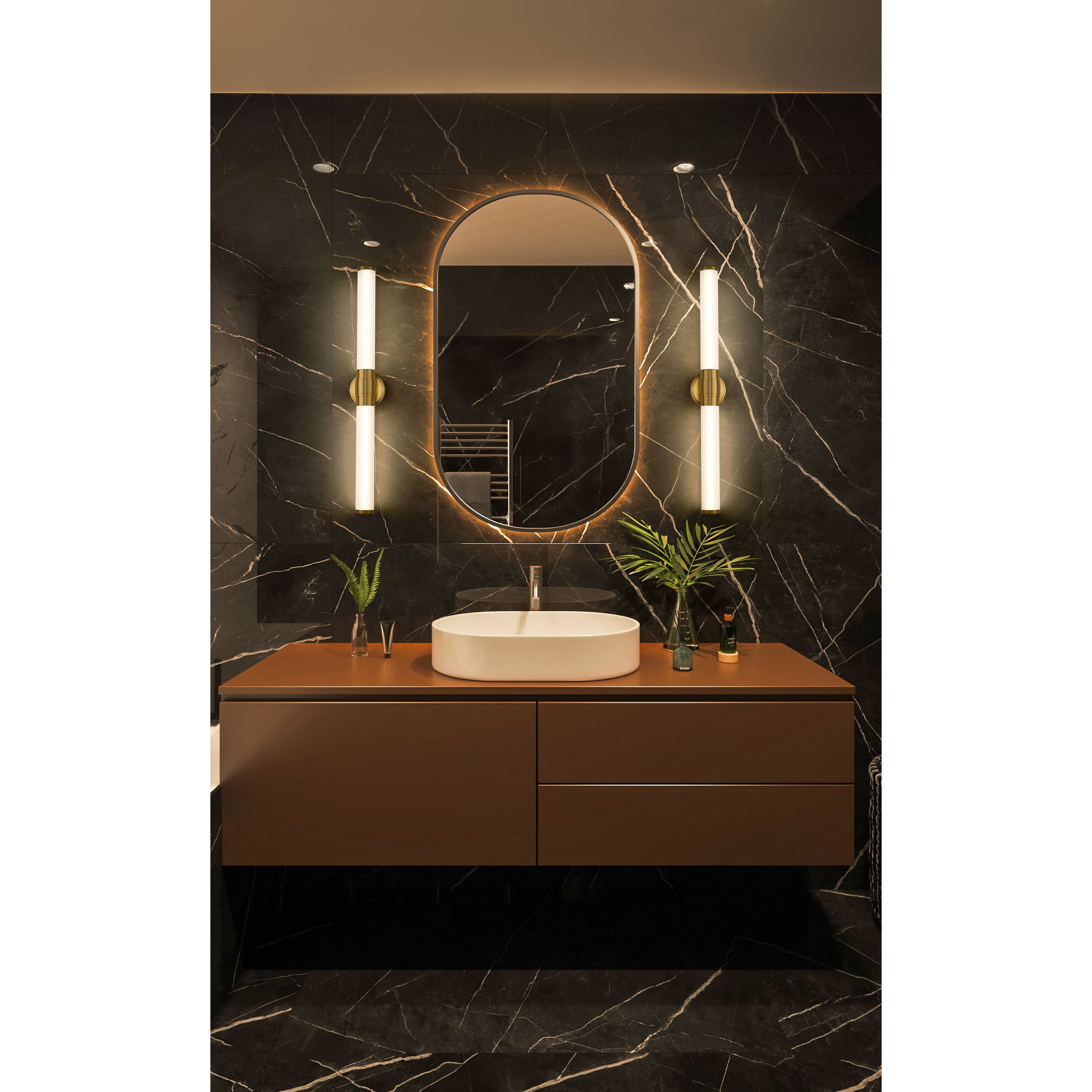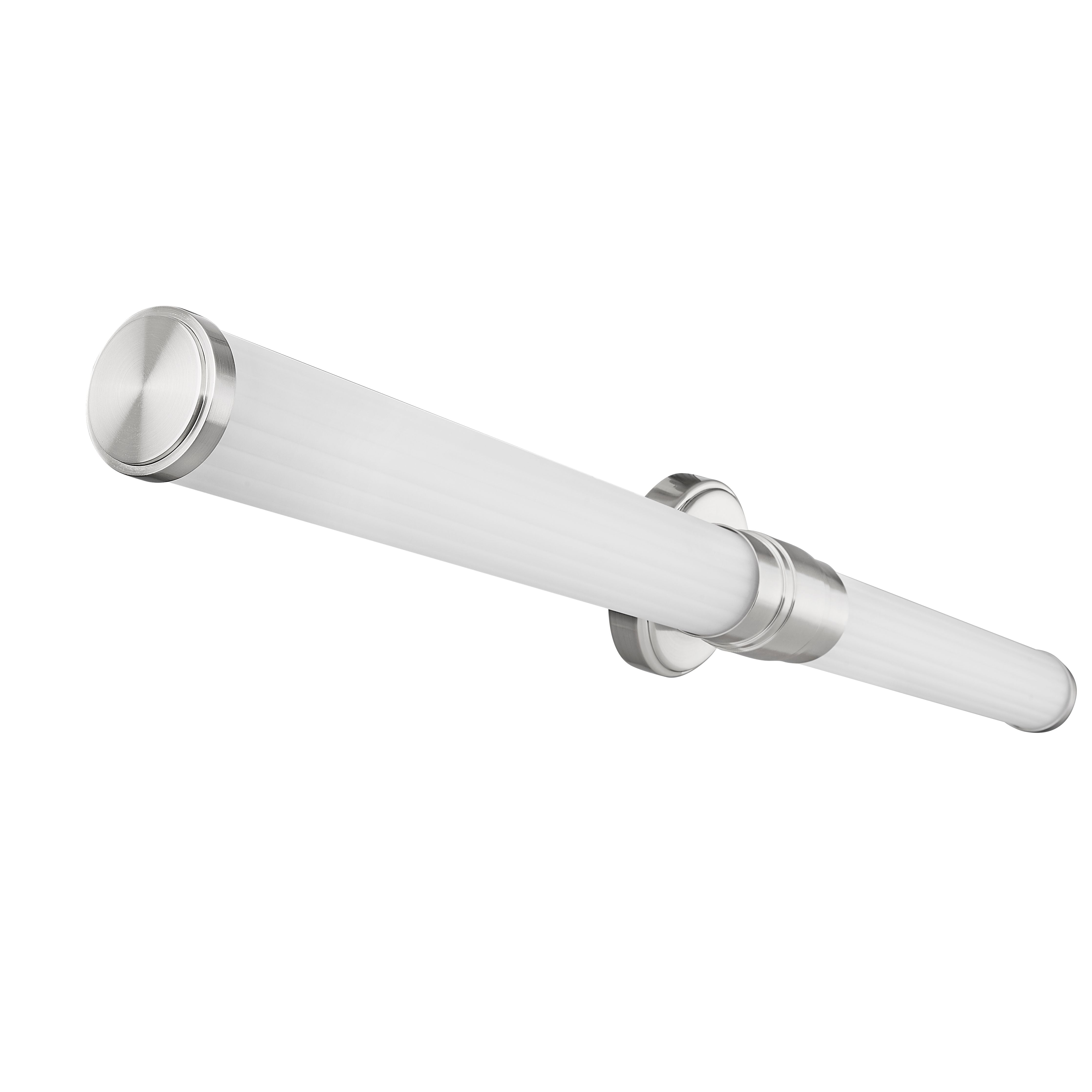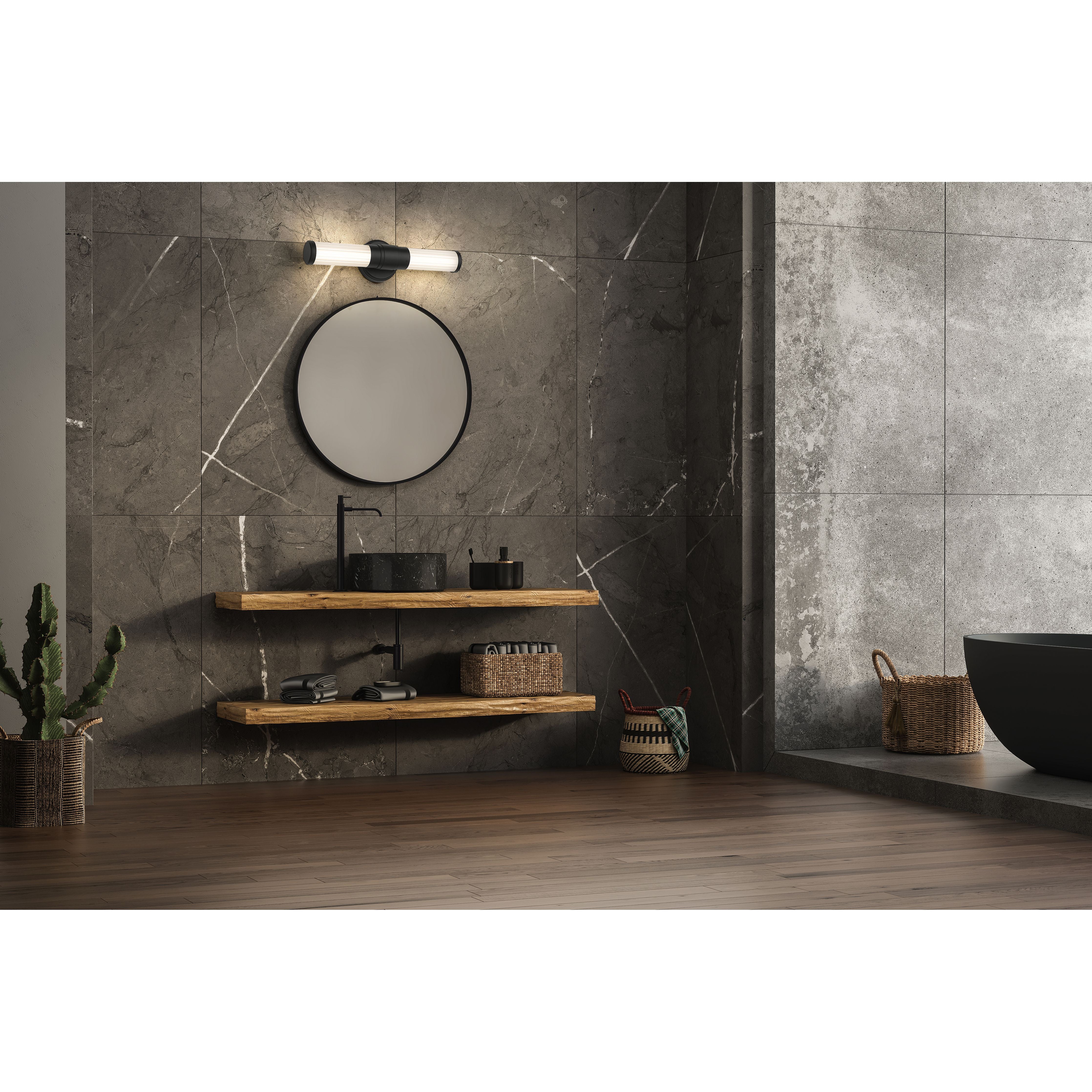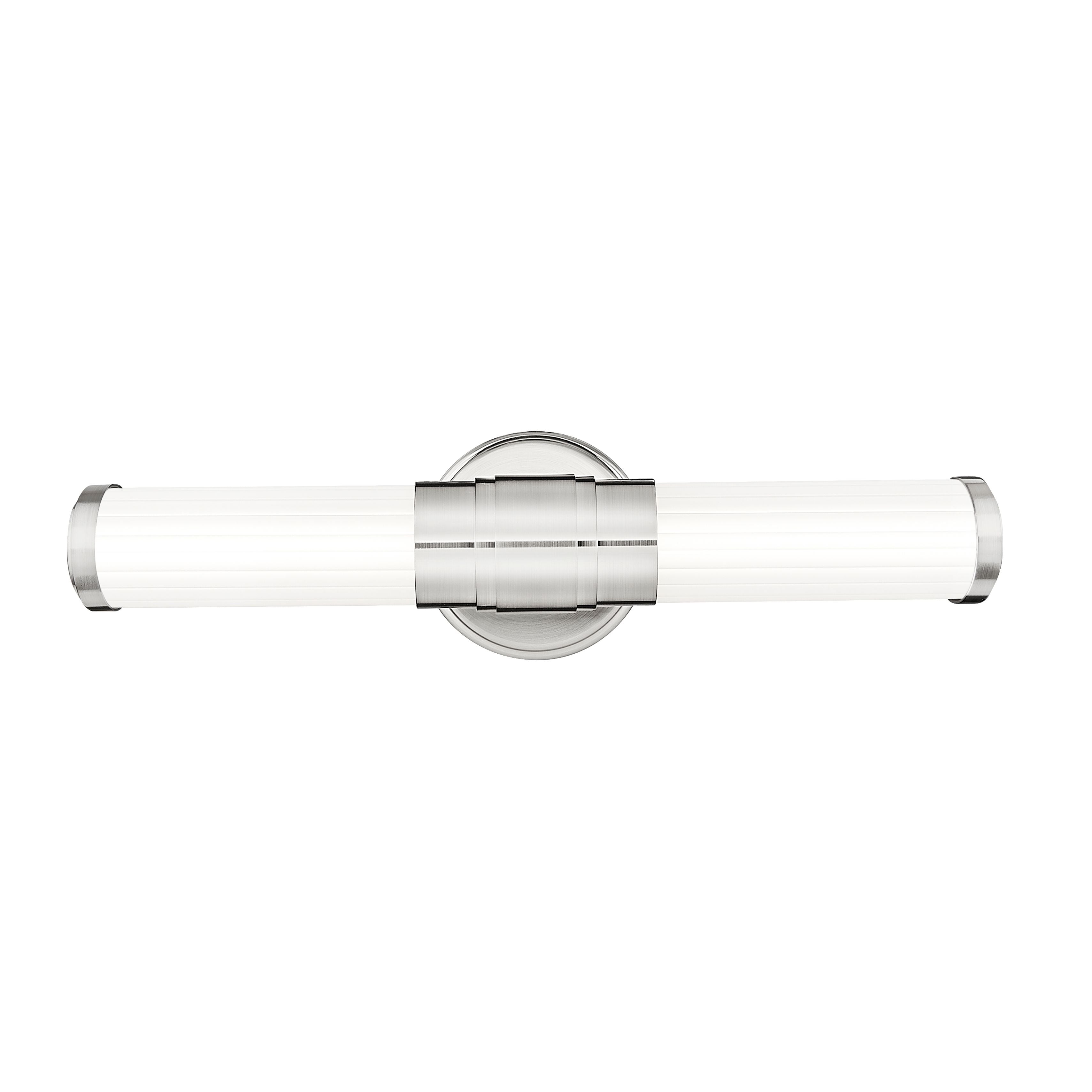 Slender ribbed glass diffusers and a stepped design on the metal arm bring a modern flair to the Warwick bath collection. These fixtures are equipped with the latest energy-saving LED technology, dimmable, light color selectable (5 choices), and a 5-year warranty (LED component). Decorative, detailed metal end caps in the same finish – a choice of Matte Black, Brushed Nickel, Chrome, and Modern Gold – complete the look. Available sizes include 18”, 25”, 32” and 40”, as well as a 16” tall sconce to suit a variety of applications.