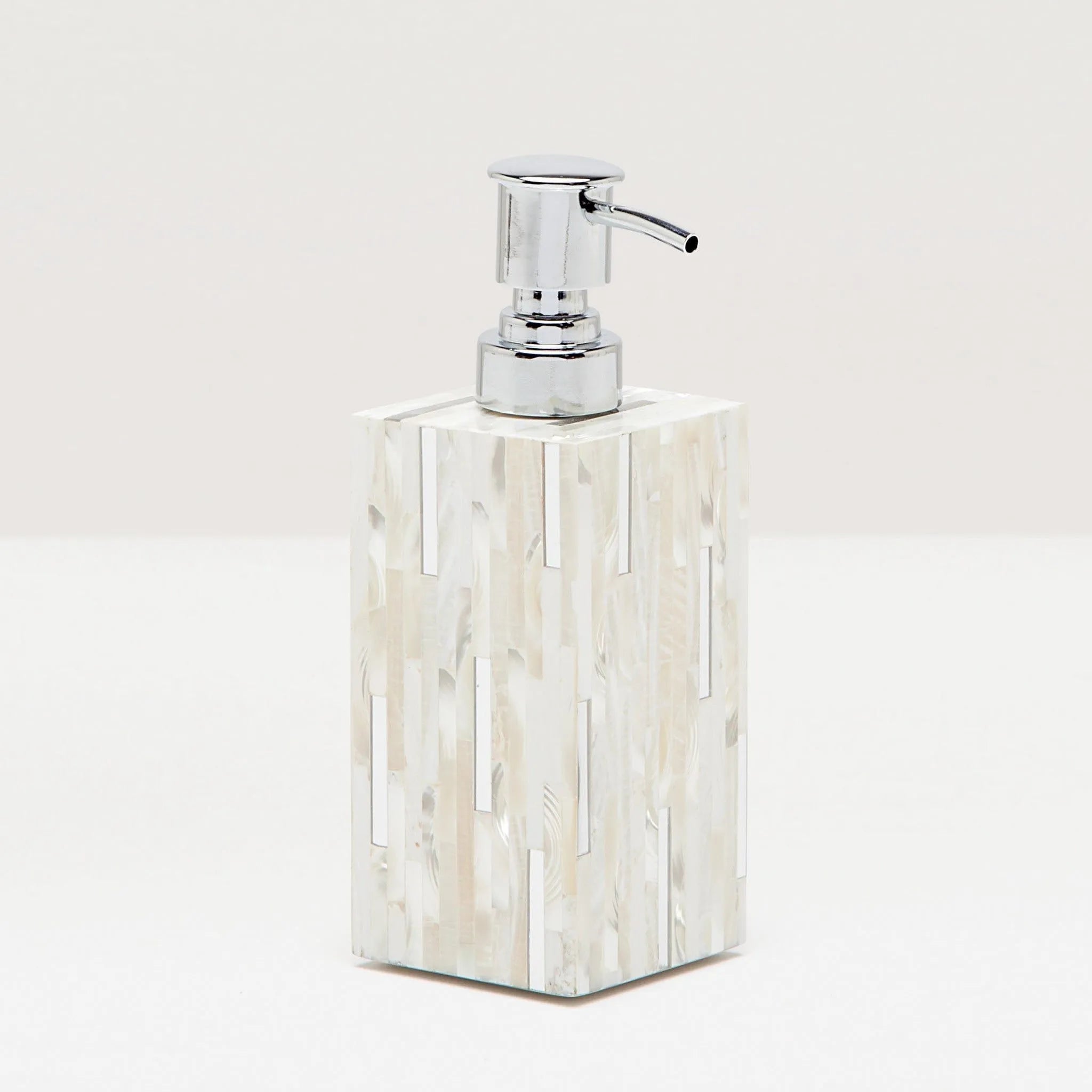 Add some understated glamour with the Cortona's sparkle. Clamstone and troca shells show the offset pattern's shimmer while metal rods add the shine. Go with brass to warm up a space, or cool it down with silver.